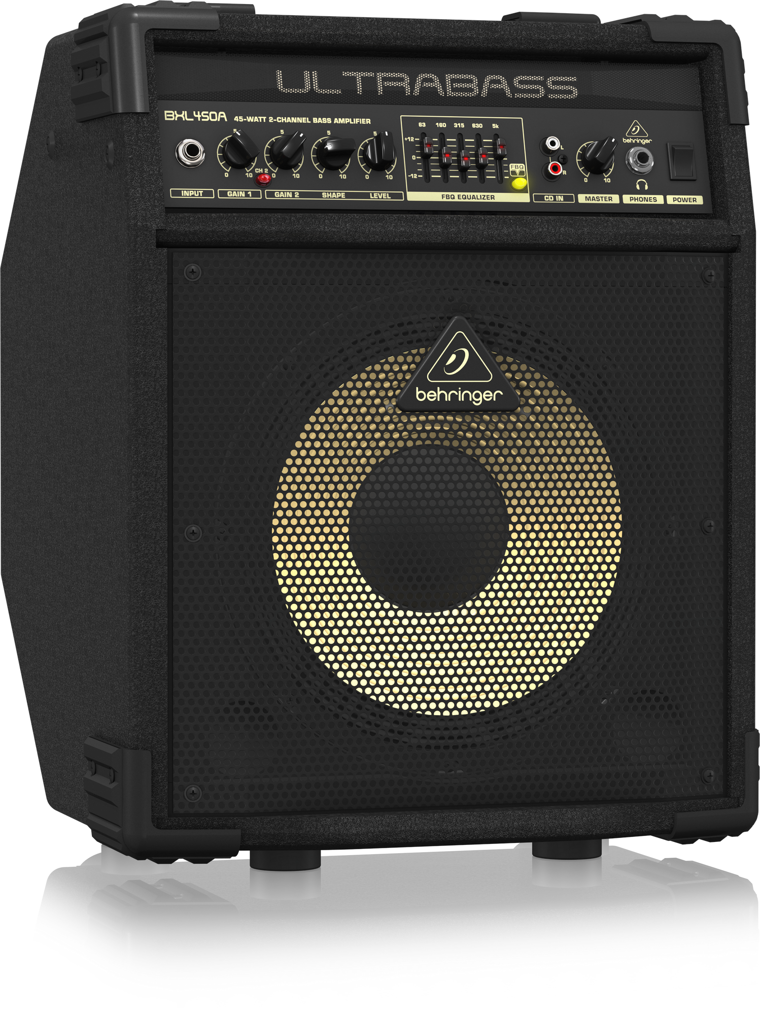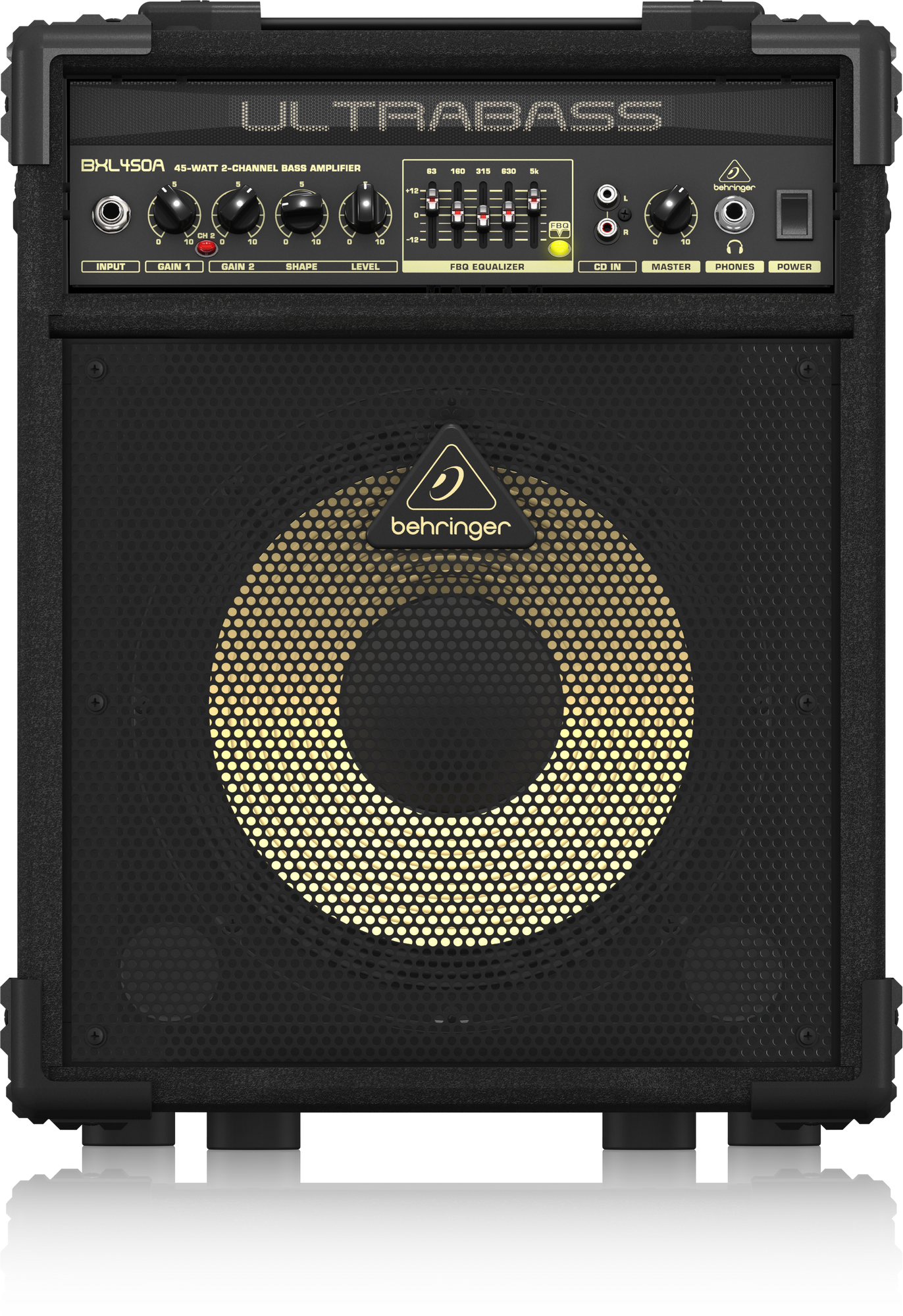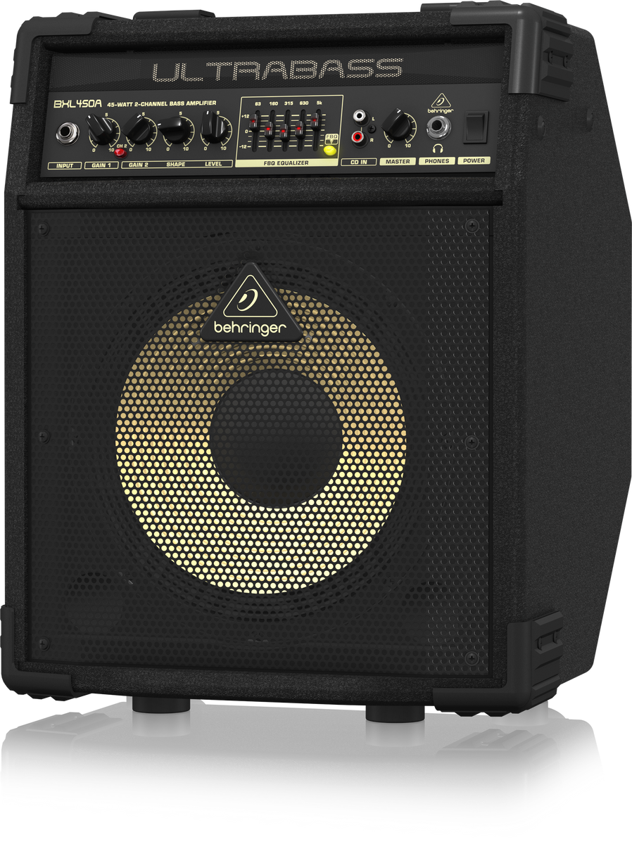 Not every gig calls for a huge bass rig, so we designed the incredible 45-Watt BXL450A specifically for those occasions – and we loaded it with amazing features and awesome functionality! With 45-Watts pumping through an original Bugera 10" Hard Attack aluminum-cone speaker, you’ll have more than enough sound to serve up tight and punchy bottom-end for a wide range of performance applications. But power is not all the BXL450A has to off er – you get 2-channel operation for everything from super-clean tones to sweet distortion-laced grind; a 5-band graphic EQ, with our revolutionary “See-What-You-Play” FBQ frequency indicator that allows you to instantly call up your favorite sounds – and a host of other professional features.