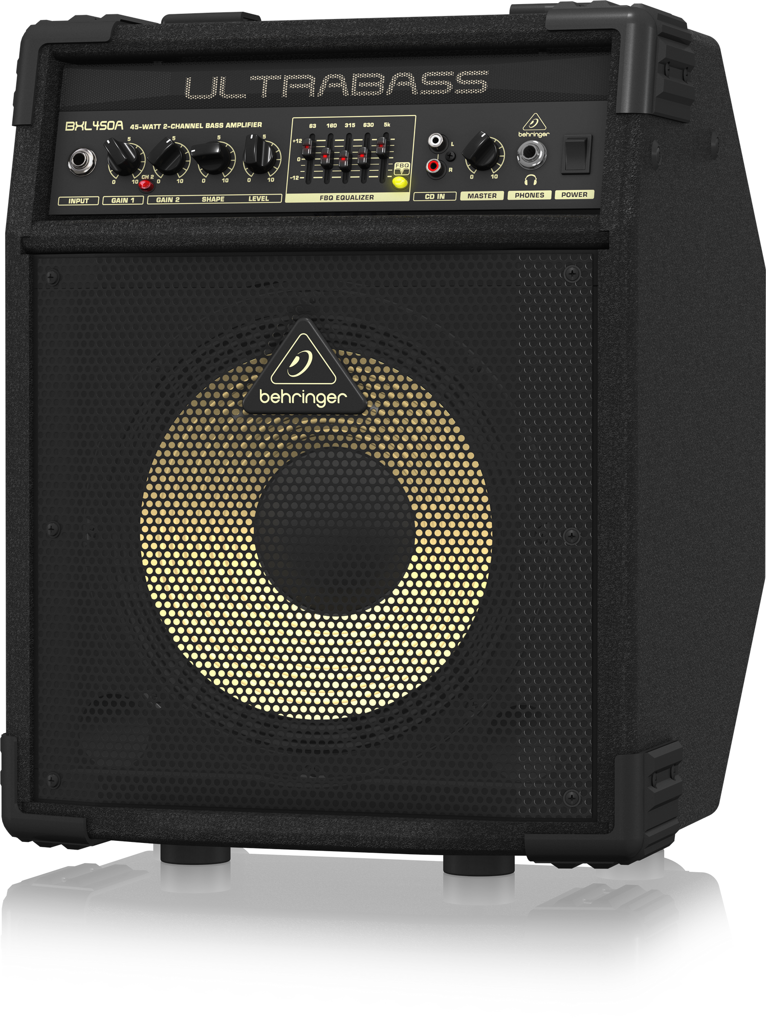 Powerful 45-Watt bass amplifier with wedge-shaped cabinet