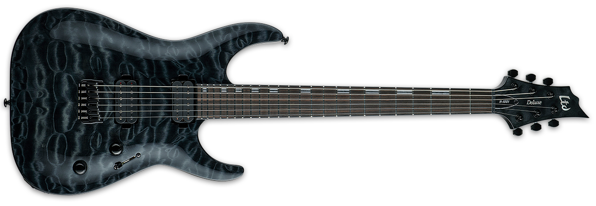 Guitars in the LTD 1000 Series are designed to offer the tone, feel, looks and quality that working professional musicians require in an instrument. The H-1001 looks spectacular with its mahogany body and a spectacular quilted maple top in See Thru Black finish, with a set-thru three-piece maple neck. It has a pair of high-output, direct-mount Seymour Duncan Sentient (neck) and Pegasus (bridge) passive pickups, splittable by a push-pull control. These pickups offer a wide dynamic range and excellent articulation, along with the aggressive responsiveness you want for today’s music. The H-1001 offers other high-quality components like a Hipshot hardtail bridge with string thru body, and LTD locking tuners.