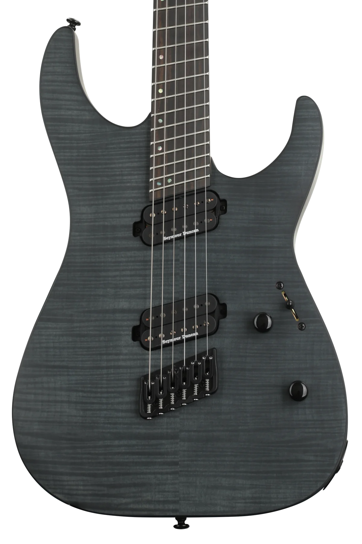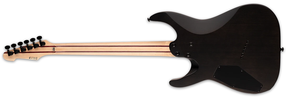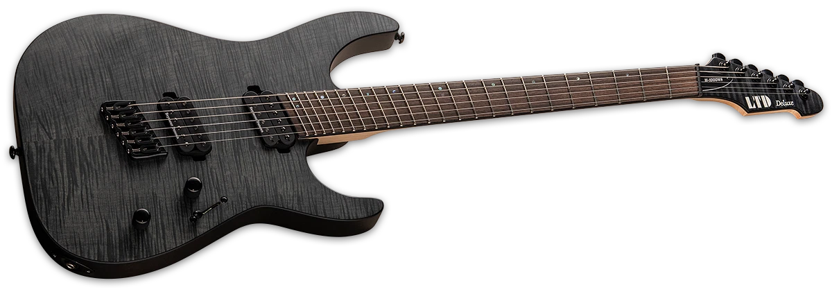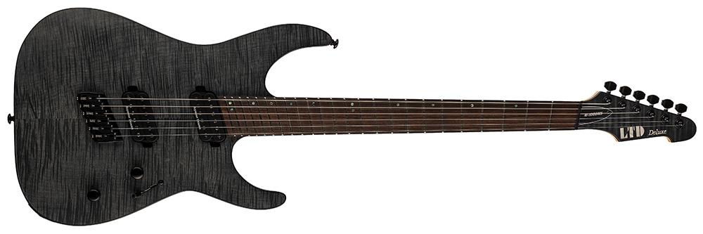 Joining the expanding list of multi-scale guitars available from ESP, the LTD M-1000 Multi-Scale is a 6-string version of the already-available M-1007MS and M-1008MS. Multi-scale guitars make use of an angled fret arrangement to offer different scale lengths for the various strings of the guitar, allowing for optimal string tension, and has also been stated by many players to offer an ergonomic improvement for the fretting hand. The M-1000 Multi-Scale has a varying scale length of 26.5” - 25.5”. It’s a bolt-on design with a flamed maple top over a mahogany back, and a five-piece neck made of maple and exotic purple heart wood, with a Macassar ebony fingerboard that includes offset abalone dot inlays. Top-tier components on the M-1000 Multi-Scale include a set of Seymour Duncan Sentient (neck) and Nazgul (bridge) pickups that were custom-made for ESP with a special angle optimized for the multi-scale design. A push-pull control on the tone knob allows for coil splitting, providing a wealth of flexible tones. Other components include a Hipshot multi-scale bridge with string-thru-body, and LTD locking tuners. Available in See Thru Black Satin finish.