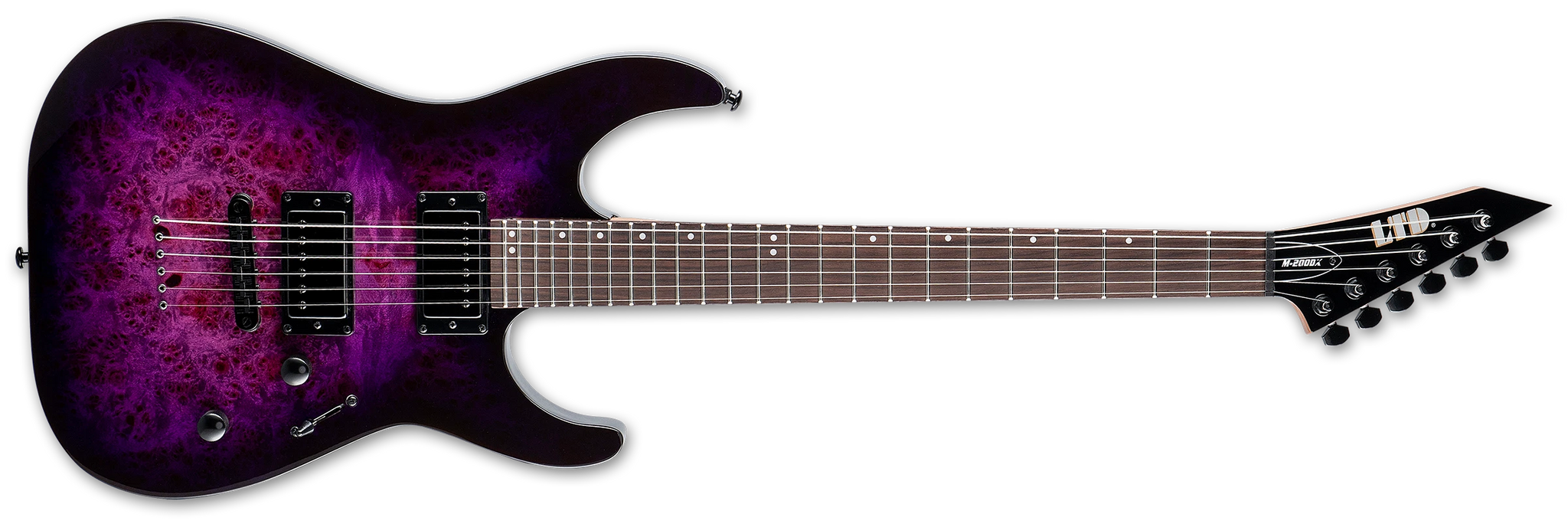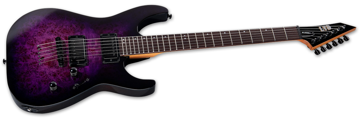 LTD’s DX range allows for musicians to get access to a high-quality guitar at a price far less than its impressive features would imply. The M-200DX offers the streamlined M shape and then adds a great-looking burled poplar top on its light, resonant poplar body. Built with bolt-on construction at 25.5” scale, the M-200DX include classy features like a roasted maple neck, rosewood fingerboard, black chrome hardware, a TOM-style bridge with string-thru-body design, full body binding, offset dot inlays, and a reverse inline headstock. The M-200DX includes a set of our acclaimed ESP LH-150 humbucking pickups with matching black chrome covers in the bridge and neck positions, providing punchy, great tone for all genres of music. You also get the flexibility of single-coil tones controlled by a push-pull switch on the tone knob.
