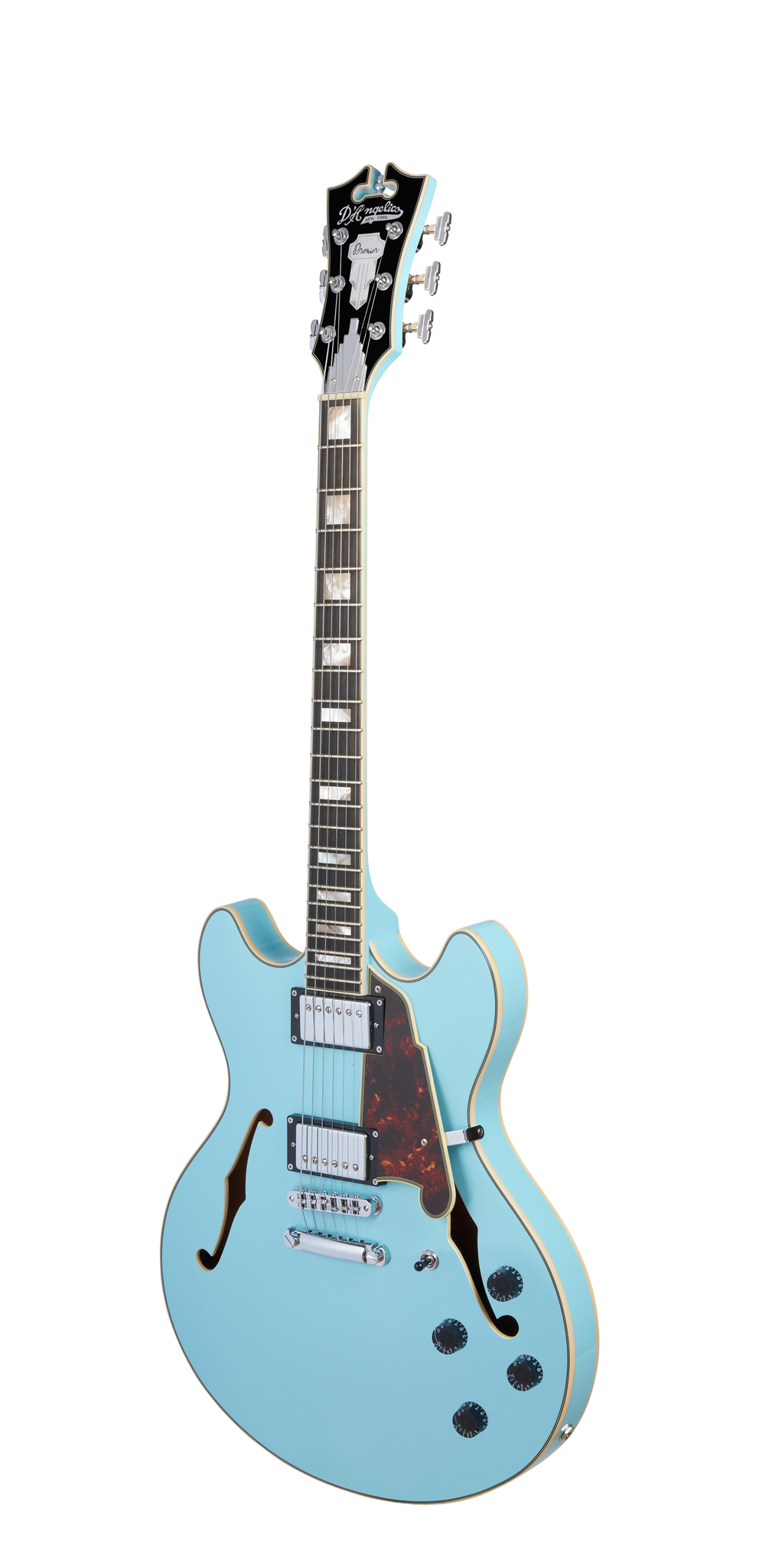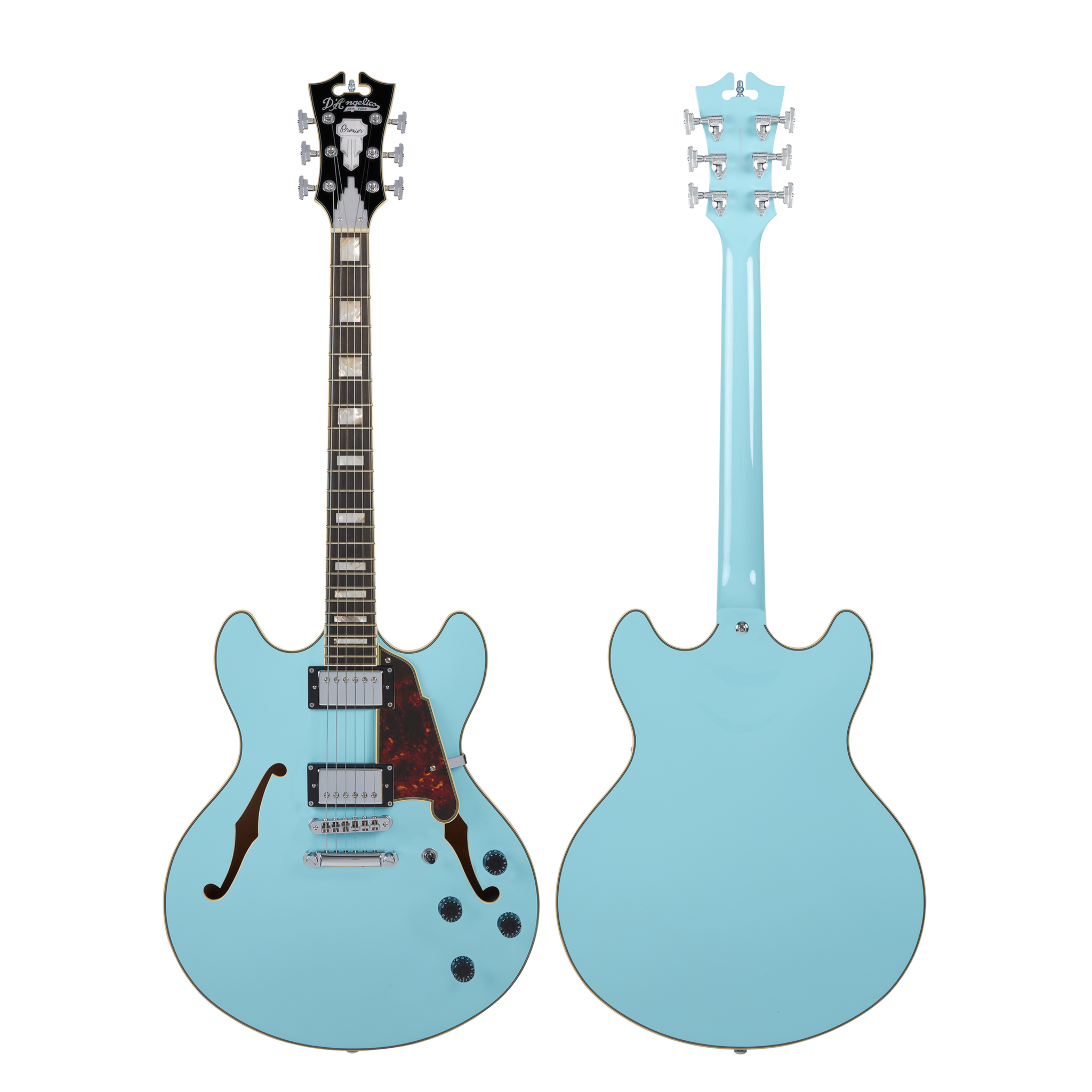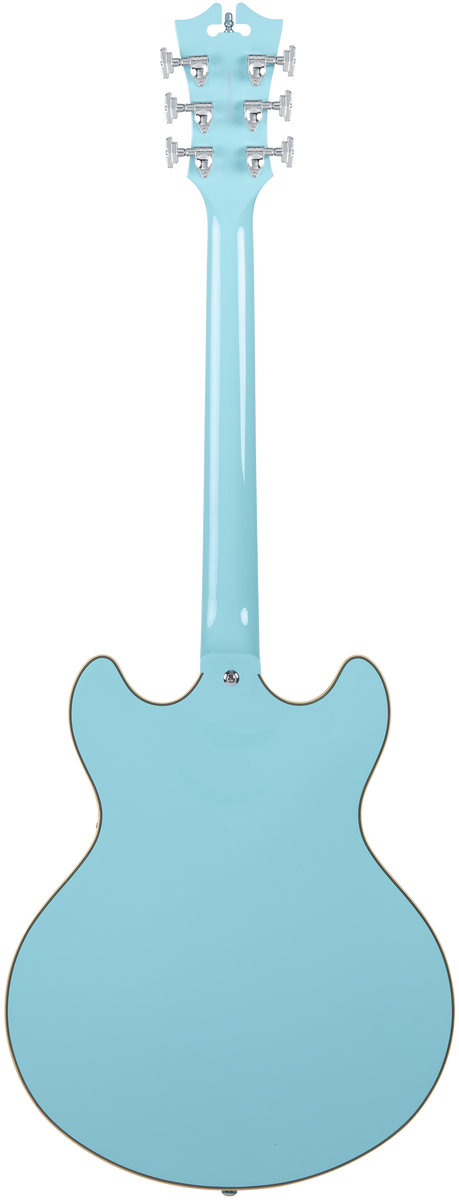 The Premier DC is a powerful double-cutaway semi-hollow offering bold tones. Driven by two Seymour Duncan Designed humbuckers, its sweet mid-range and glassy high-end provide perfectly balanced output. Its 16-inch-wide body is offset by extreme comfort in its contours and slim neck shape. Equally suited across genres, the Premier DC's tones are as diverse as they are rich—from round, clean jazz to bright, searing rock. available in Sky Blue.