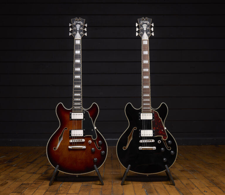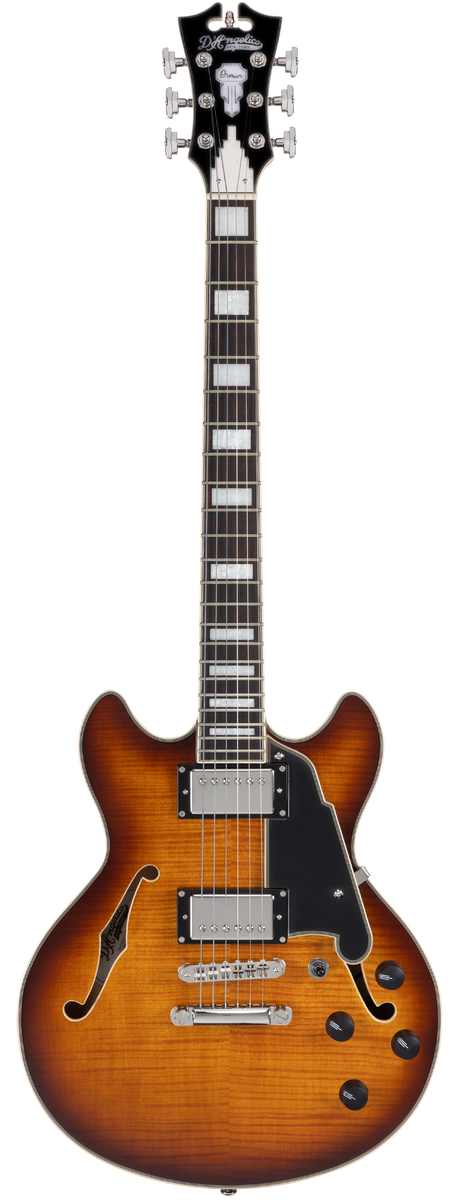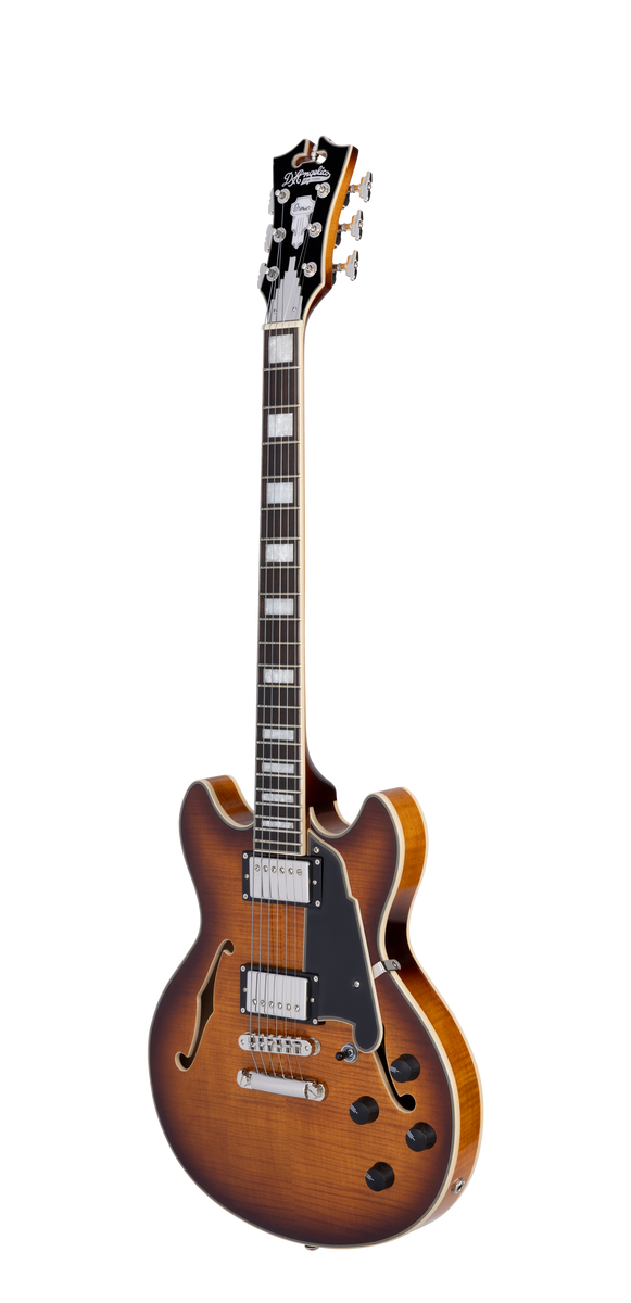 A curvaceous and compact double-cutaway semi-hollow, the Mini DC is D’Angelico’s preeminent semi-hollow design. Available in figured maple or standard maple.