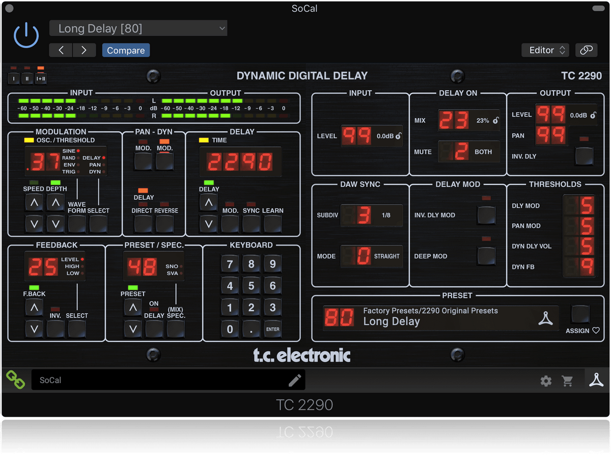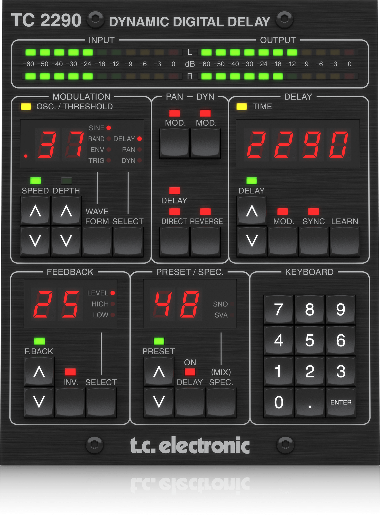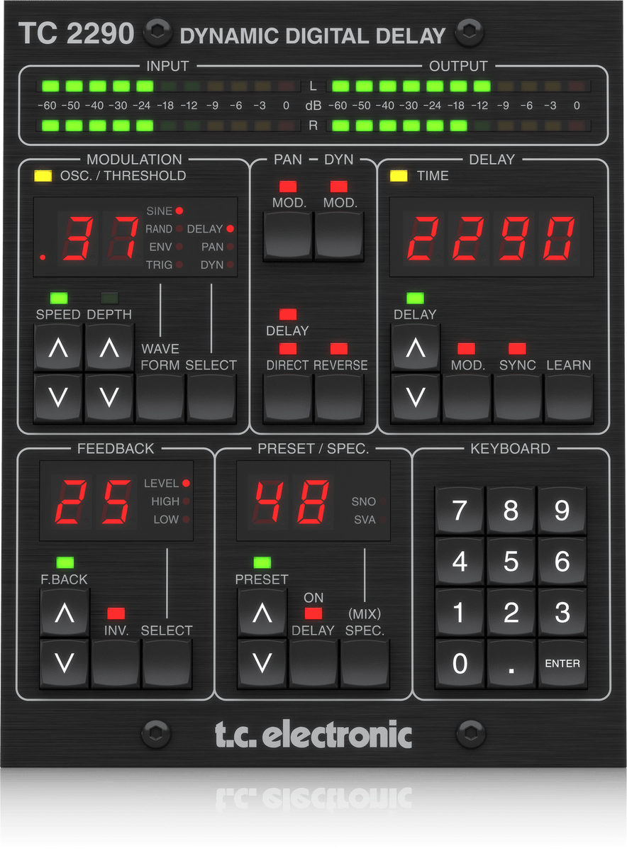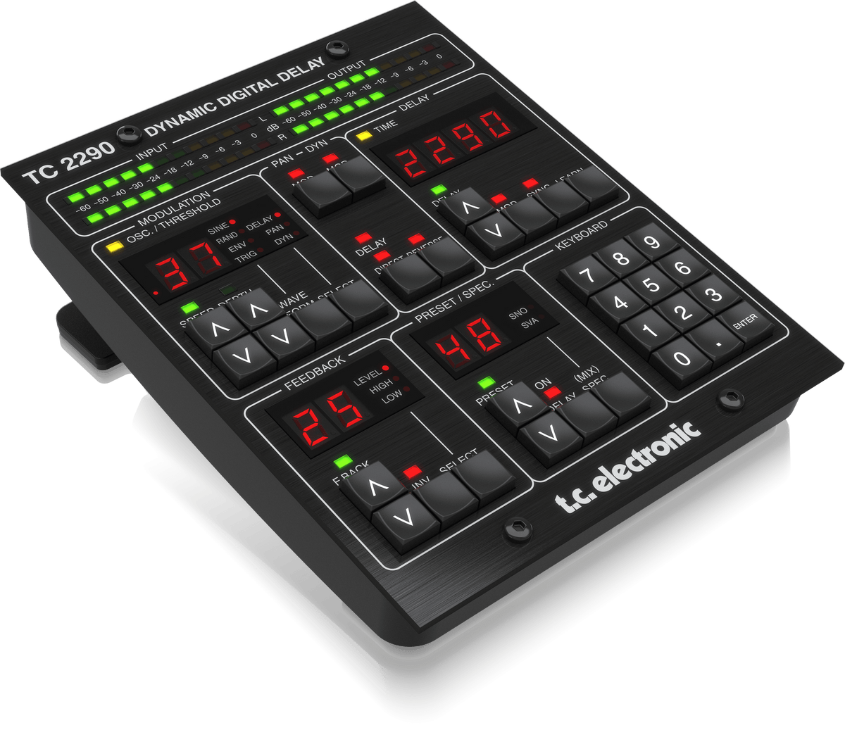 The optional hardware add-on for TC2290 provides high-resolution input and output meters for accurate signal monitoring directly on the interface, plus all tone-defining parameters including delay time, feedback level, modulation, mix settings and much more.