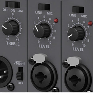 | Controls | Level, Line/Mic, Low Cut, Speech/Music, Bass and Treble, Front LED, Mains on/off |