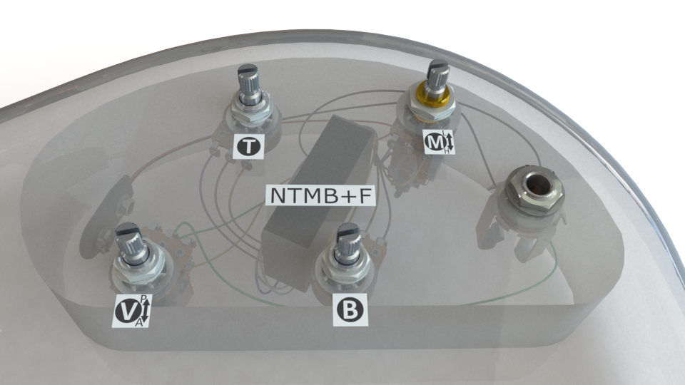 Our most popular preamp for decades, the NTMB+F is a 3-band tone control preamp with fully independent Bass, Mid and Treble controls. It is well known to professionals for its very low noise and wide boost and cut range for aggressive control. The voice is clear, transparent, and strong. The treble frequency is set high for maximum available brightness.
