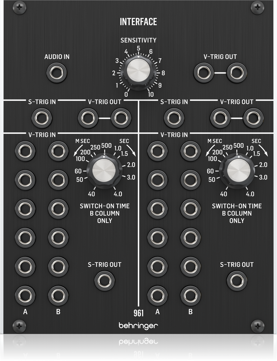 Controls on the 961 include a Sensitivity knob that adjusts the gain of the audio signal coming into the module via the Audio In jack. Column B in each V-Trig In bank has a Switch-On Time knob you can use to manually control how short or long the “ON” duration is for S-Trig signals. This feature is normally used to drive the 911 envelope generator. Add a 960 sequential controller to release the full creative potential of this interface module.