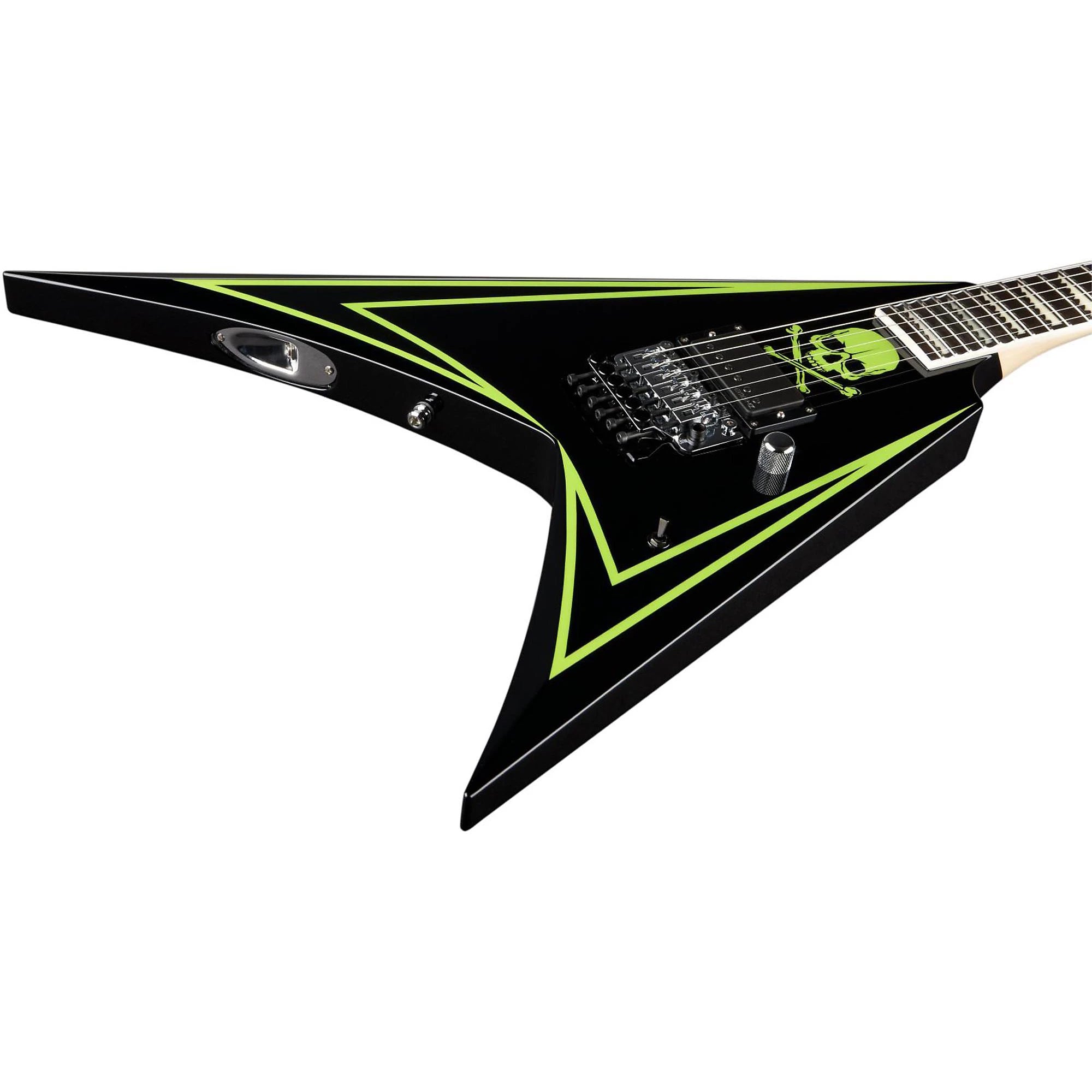 Alexi Laiho is the frontman of Finnish melodic death metal superstars Children of Bodom, and the Alexi-600 Greeny is his most popular LTD Signature Series guitar. It's an offset V-shaped guitar with neck-thru-body construction. It pairs a comfortable alder body with a fast and smooth three-piece thin U-shaped maple neck, with an ebony fingerboard that features 24 extra-jumbo frets and green-tinted sawtooth triangle inlays. The Alexi-600 Greeny's aggressive sound is powered by a single EMG HZ F-H2 passive pickup. Other components include a Floyd Rose bridge and Grover tuners. It comes in Black finish with lime green pinstriping and skull graphic.