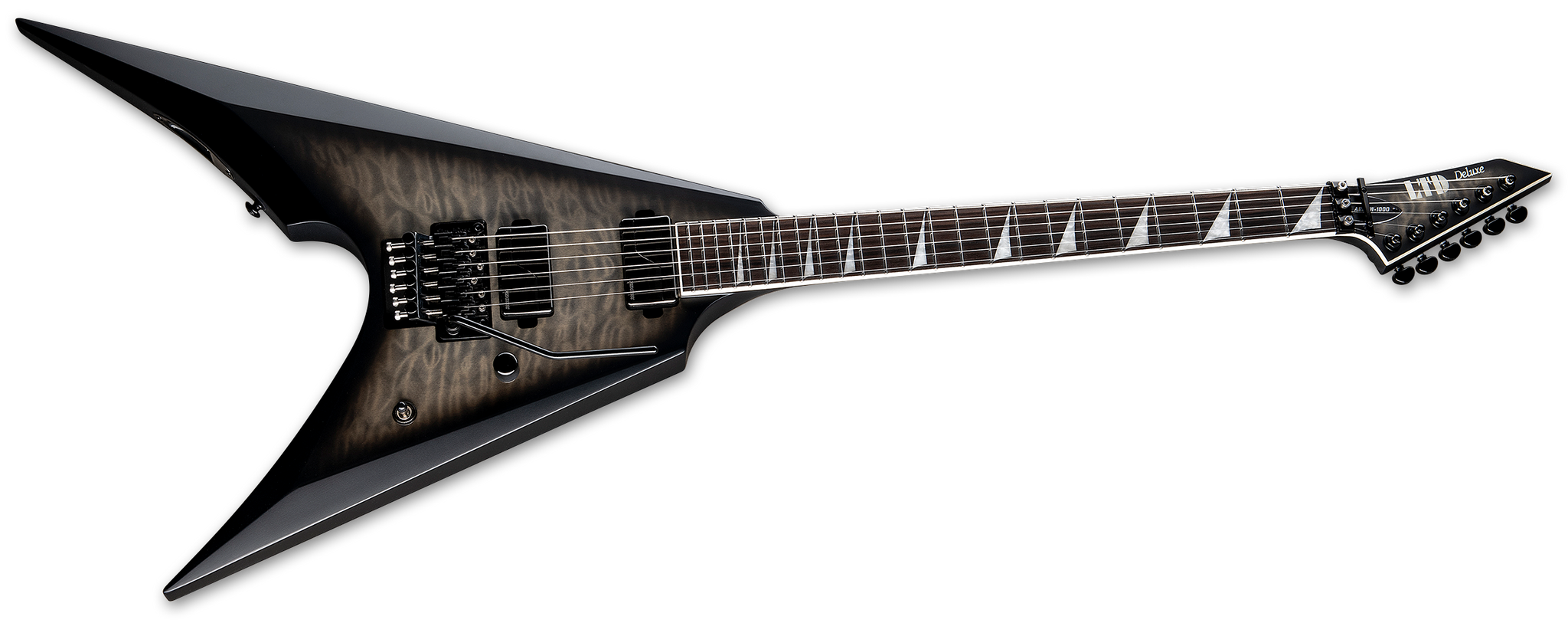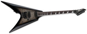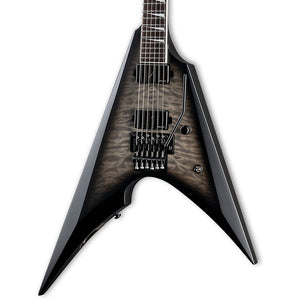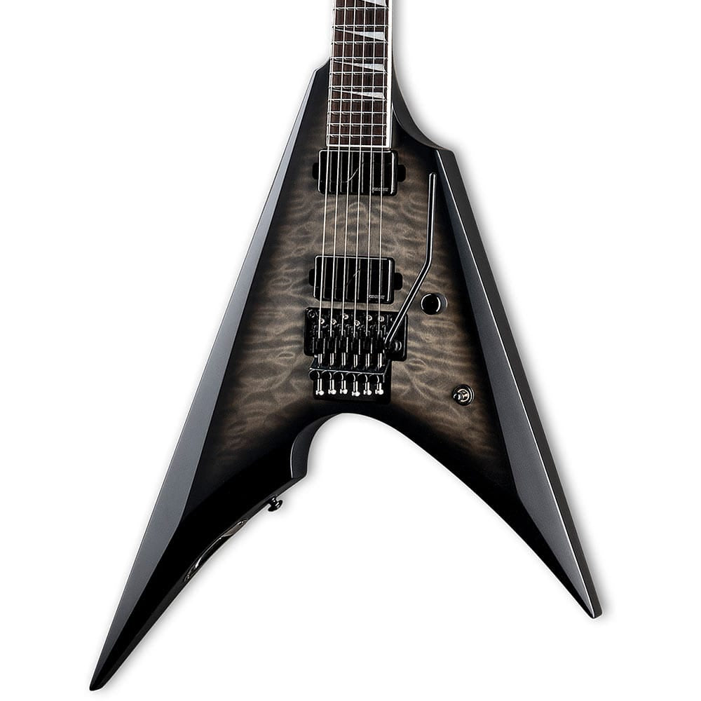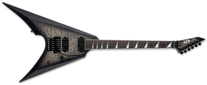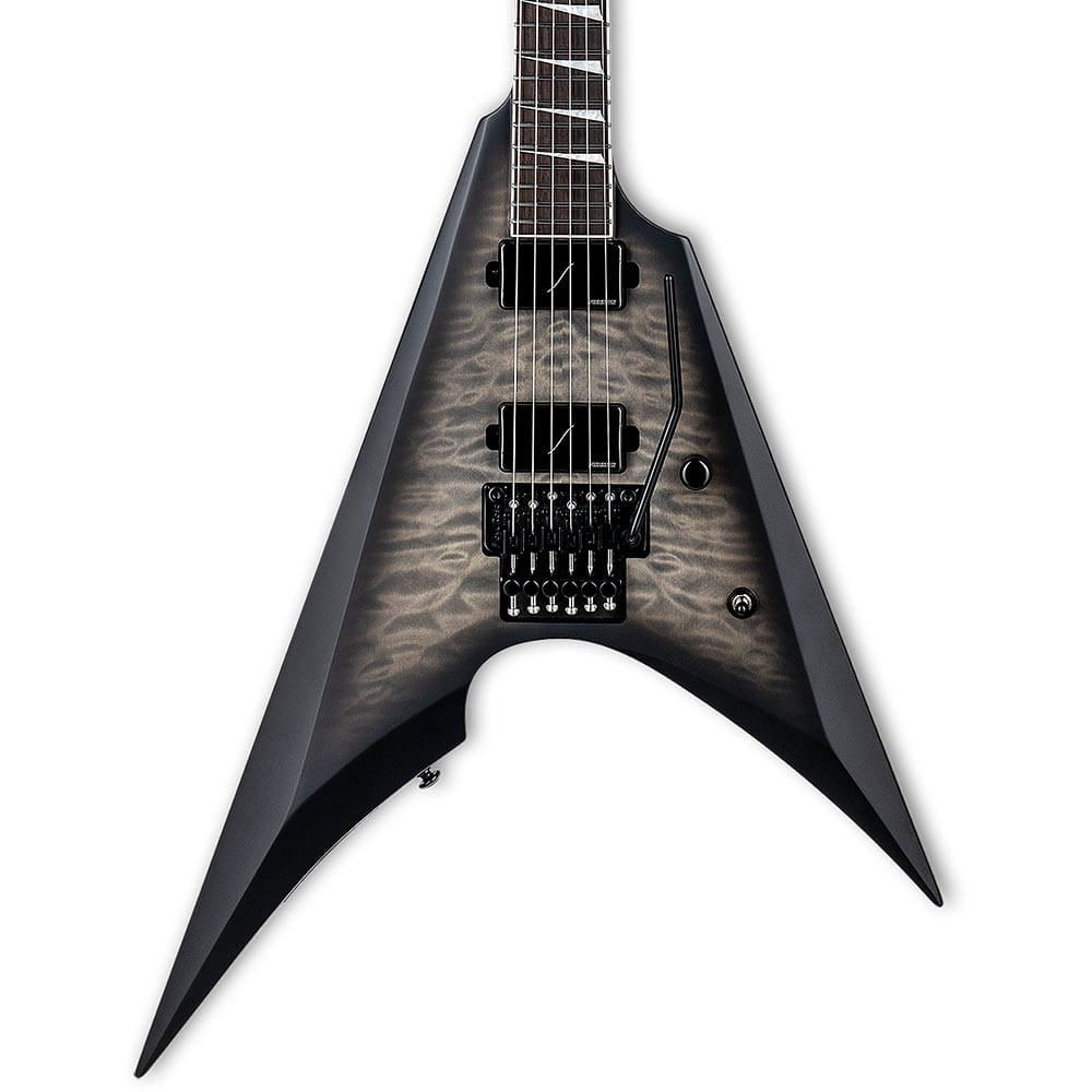 Guitars in the LTD 1000 Series are designed to offer the tone, feel, looks, and quality that working professional musicians need in an instrument. The Arrow-1000FR is a special member of the Arrow family, with its quilted maple top in Charcoal Sunburst Satin finish. It features neck-thru-body construction with mahogany body, 3-piece maple neck, reverse headstock with matching flamed maple finish, and Macassar ebony fingerboard with triangular white pearloid inlays and stainless steel frets. The sound of the Arrow-1000FR comes from its set of direct-mount Fishman Fluence Modern Humbucker active pickups (alnico in the neck and ceramic in the bridge), with push-pull control to select voicings and black nickel covers to match this guitar’s outstanding aesthetics. These pickups offer an outstanding variety of huge tones that range from aggressive and punchy to smooth and articulate. Components include a Floyd Rose 1000SE bridge with stainless steel screws and precise Grover tuners.