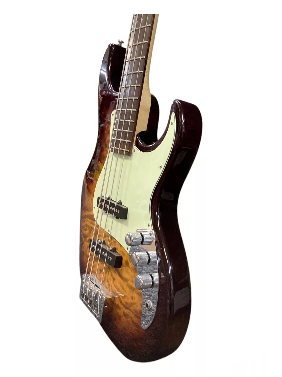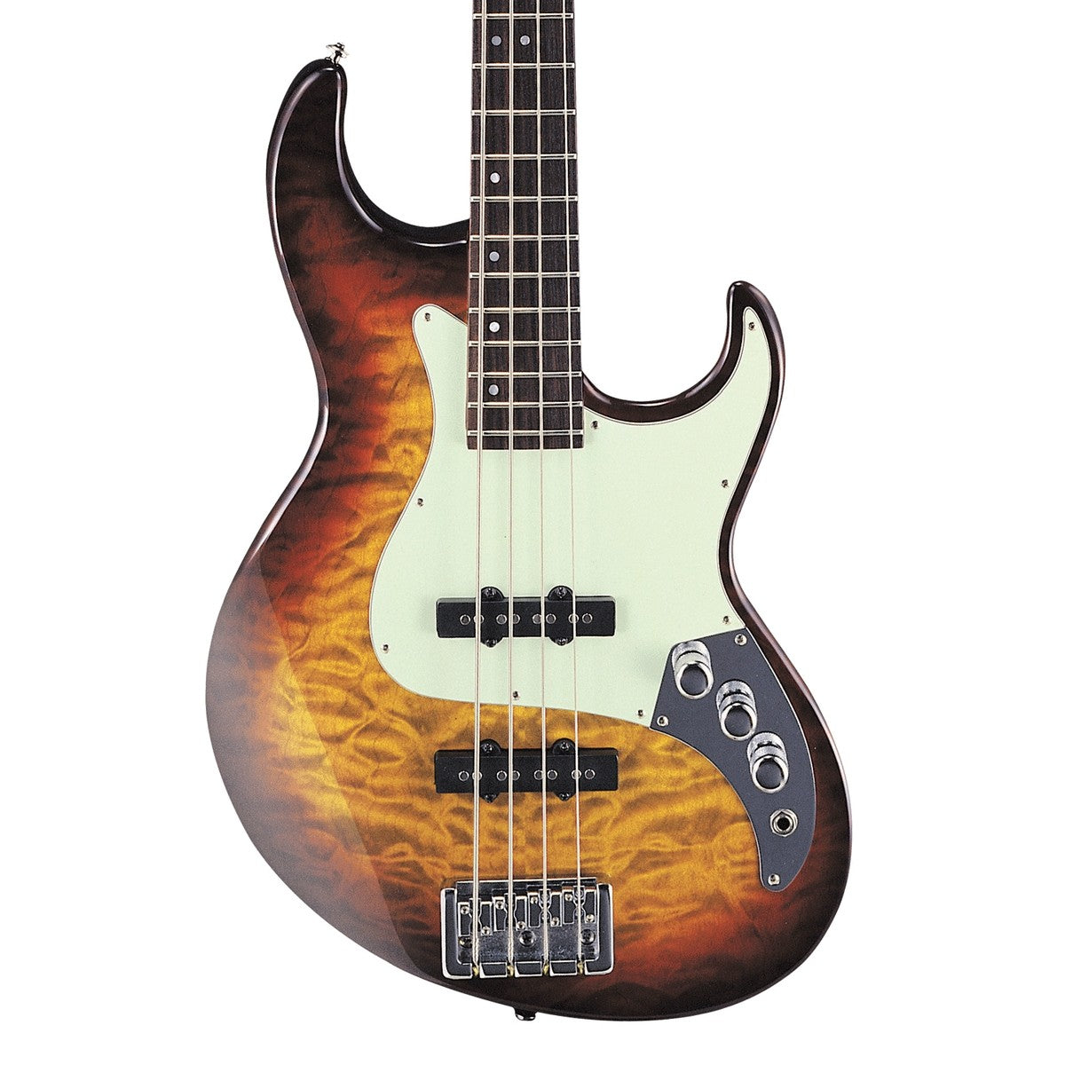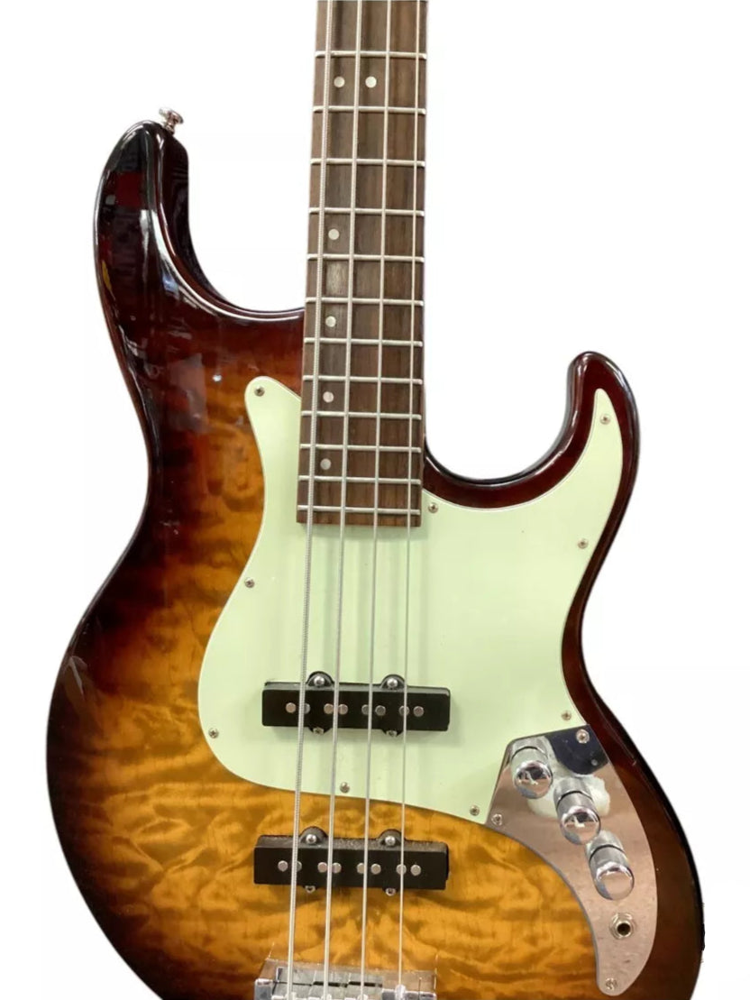 The Fairlane FN-4 Bass Guitar incorporates a Mahogany body and Maple neck construction to offer a resonant, warm and rich tonality. Heavier in weight than Basswood or Ash, Mahogany is a dense wood which adds to the bass and low middle response helping to produce a thicker and rounded tone. Paired with a quilted top the Fairlane FN-4 sports an attractive Vintage Sunburst finish sure to stand out on any stage. The neck is a speedy Maple wood which produces bright dynamics and a quick note attack.