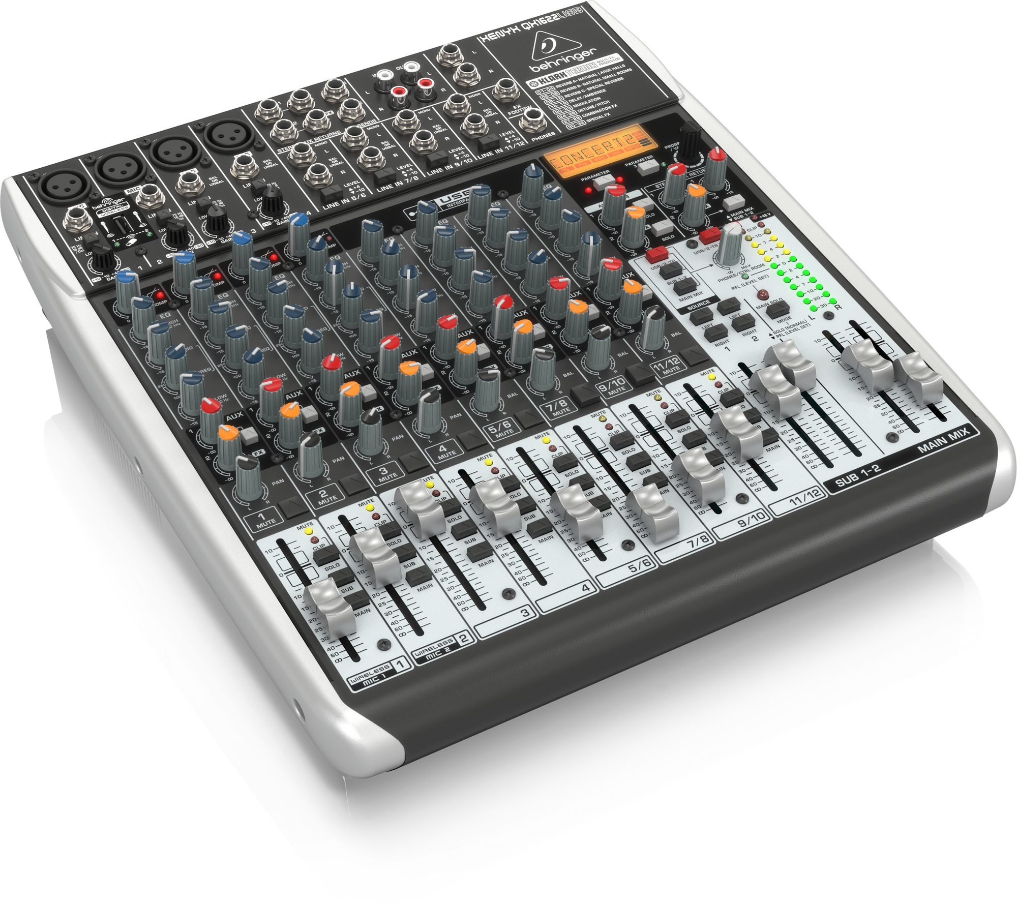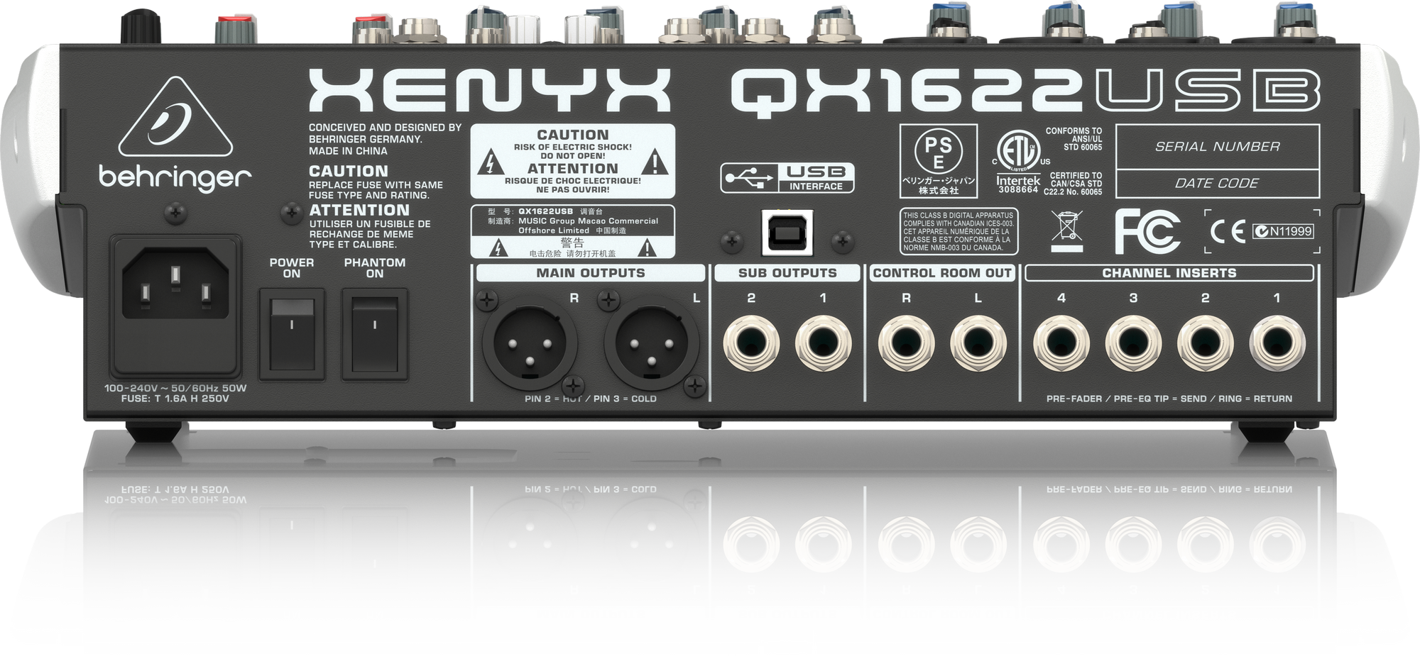 The XENYX QX1622USB comes equipped with channel Inserts and our “British” 3-band EQs with semi-parametric mid band on all mono channels, plus 4-band fixed EQ on the stereo channels. Other features include 2 Aux Sends: 1 pre/post fader switchable for monitoring/FX applications, 1 post fader (for internal FX or external send) – plus Clip LEDs, Mute, Main Mix and Subgroup routing switches, Solo and PFL functions on all channels.