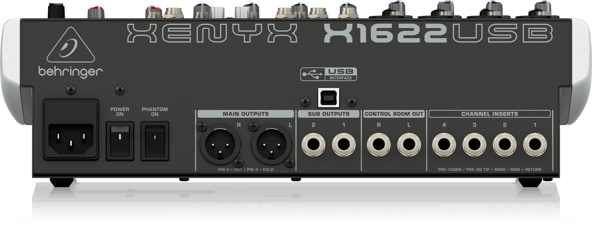 The XENYX X1622USB comes equipped with channel Inserts and our “British” 3-band EQs with semi-parametric mid band on all mono channels, plus 4-band fixed EQ on the stereo channels. Other features include 2 Aux Sends: 1 pre/post fader switchable for monitoring/FX applications, 1 post fader (for internal FX or external send) – plus Clip LEDs, Mute, Main Mix and Subgroup routing switches, Solo and PFL functions on all channels.